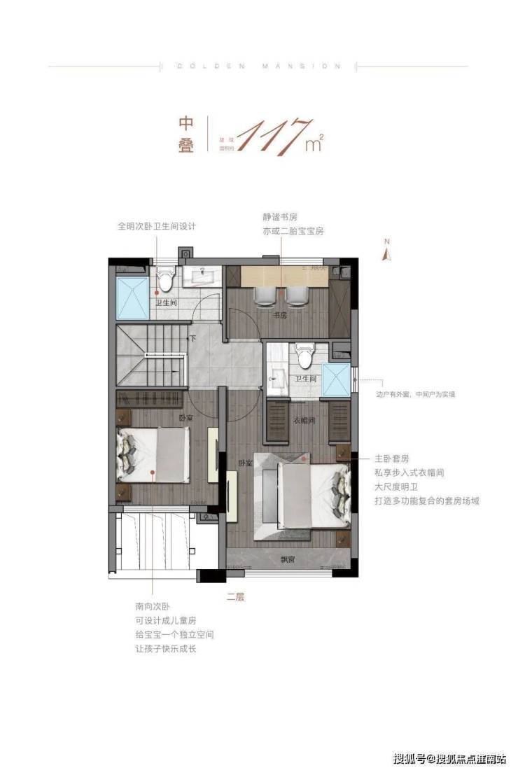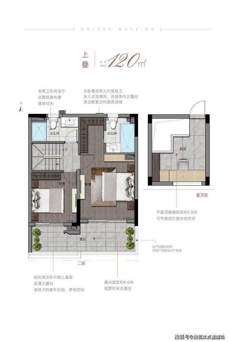 将卧室,衣帽间、独立卫浴和书房一体化配备,作为一个功能齐全的大套房,满足青年人工作、生活、亲子的全方位需求。