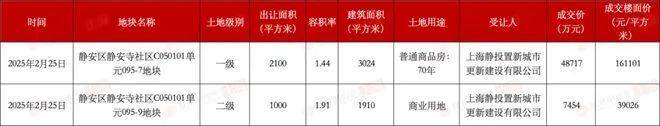 另一块地,静安区静安寺社区C050101单元095-9地块,为商业用地,该地块用地面积为0.1万平方米,容积率为1.91,总建面0.19万平方米,成交价7454万元,楼面价39026元/㎡。