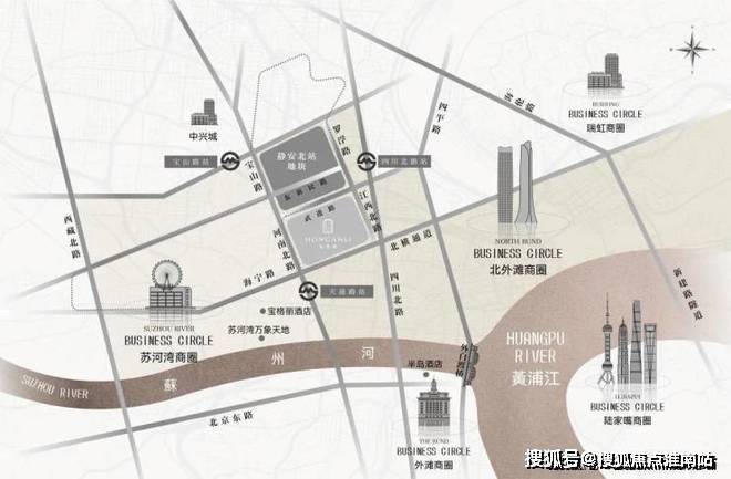 仅从图上看,该地块直线距苏州河约1公里,直线距外滩约1.4公里,直线距北外滩约1.7公里,直线距3/4号线宝山路站约300米,直线距10号线四川北路站约560米,区位优势明显。