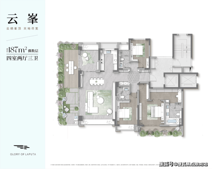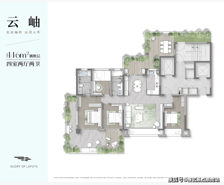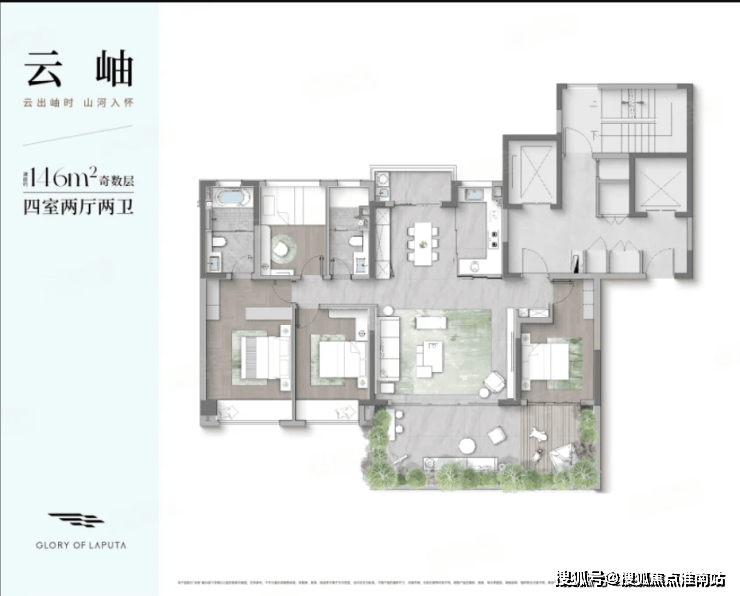户型点评:4房2卫的房屋套型;偶数层南向超大L型空中庭院;四开间、三卧室朝南设计;偶数层北面有个北庭院;