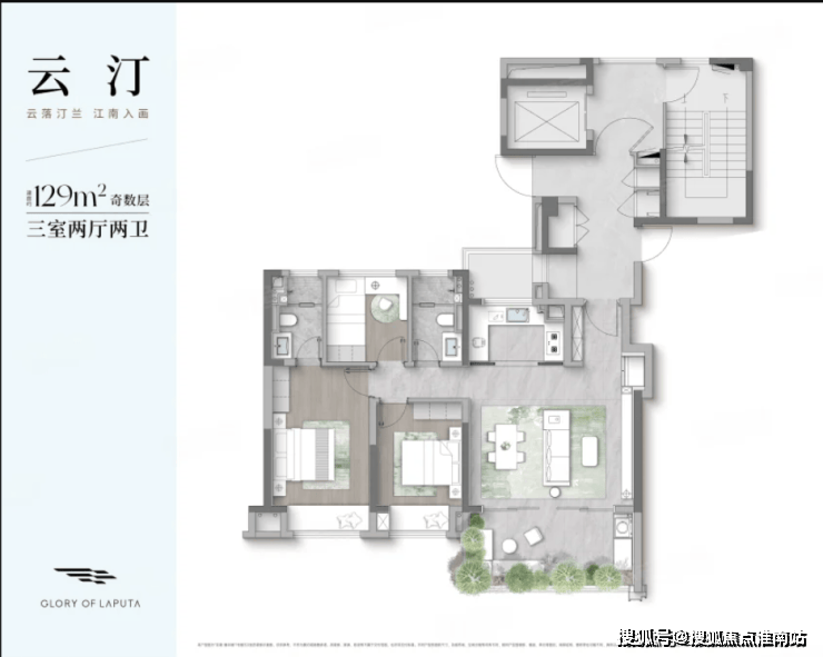 户型点评:3房2厅2卫的房屋套型;3开间朝南,客厅+餐厅的宽厅设计;南向超大空中庭院;主卧是套房设计,有独立的卫生间和衣帽间