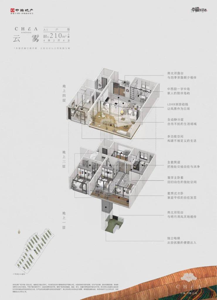 例如起步建面约210方上叠户型-云雾,上下都配备专属电梯私家入户,上叠行政级主卧+两间大尺度次卧,均是套房设计,做到了真正的全屋套房平权,主卧更是在南北做到了双面花园景观入室。