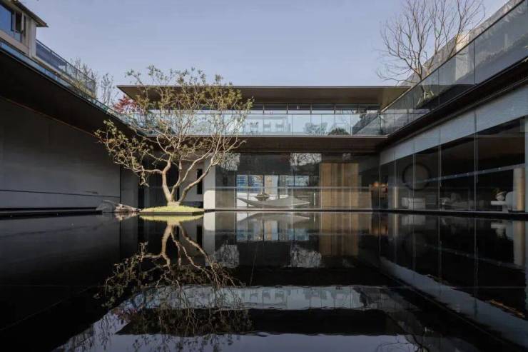 大面积铝板+大面积玻璃相结合,让项目拥有简洁的外观和广阔的观景视野,在檐下空间与建筑装饰上,点缀橡木灰金属材质,与青山秀水交相辉映。