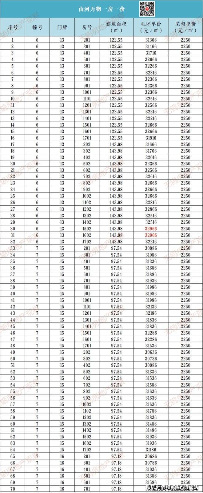 爱情山河万物一房一价表: