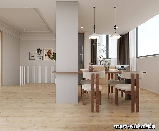我们拆掉了餐厨之间的非承重结构,做功能融合。保留下来的承重柱,利用木质材料饰面。有序变化的木纹肌理起到视觉延伸的作用,温润的质感多了几分温馨治愈气息。