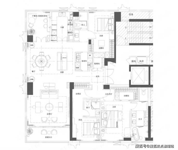 “楼王”产品——约230-286平方米江景大平层,西边户配备270度落地采光窗,主卧套房面积约40平方米,带独立卫生间、步入式衣帽间和观景飘窗。中西厨分离设计、嵌入式高端家电配置,则满足了高端家庭的宴请需求。