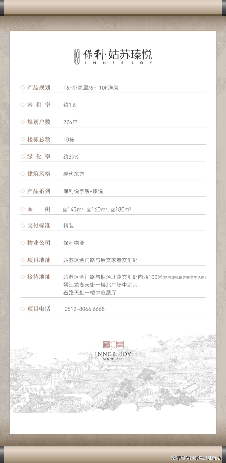 保利姑苏瑧悦,规划6-10F纯洋房+16F小高层的产品形态,容积率仅为1.6,打造建筑面积约143-178㎡东方美学洋房。难得古城低密洋房,仅276席,敬献姑苏生活。苏州保利姑苏瑧悦售楼处电话☎:400-891-9910【开发商售楼处预约看房热线】(一对一热情vip服务)