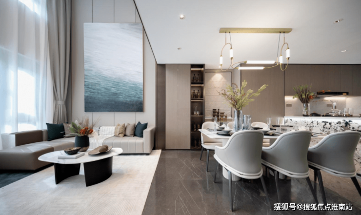 一层主会客,客餐厅一体化设计,客厅开间约4.7米,连上餐厅,整个进深接近7米。