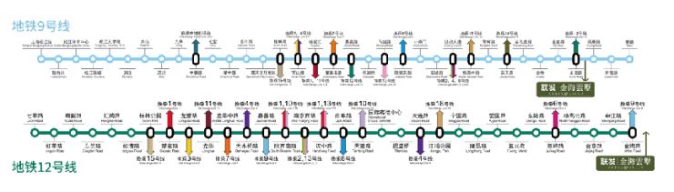 9/12 号线金海路站步行可达,9 号线直达陆家嘴、世纪大道,12 号线贯通全城