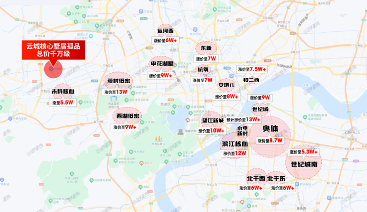 蒋村低密地块,楼面价8.8万+,放风单价13万以上,一套总价要6000万起;湖墅民生药厂地块,叠墅预计售价13万+,总价3600万-8000万;和家园玺园均价9.06万/平,总价1700万-3000万以上……