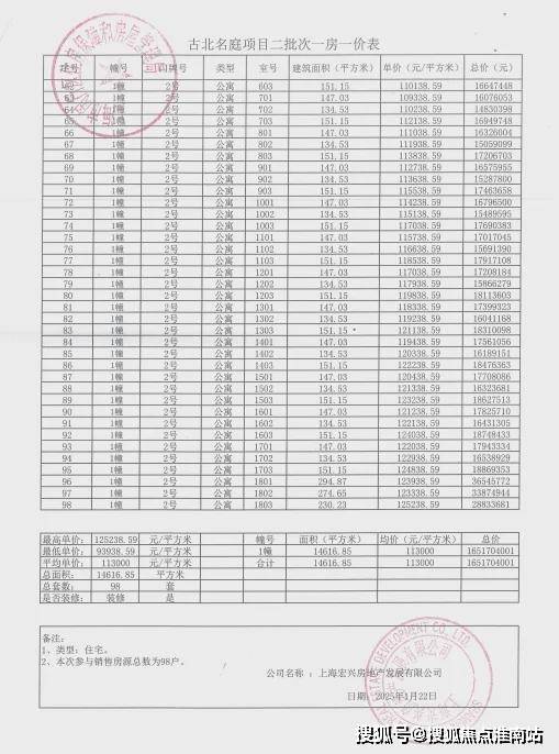 上期一房一价表如下