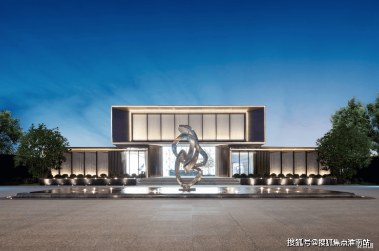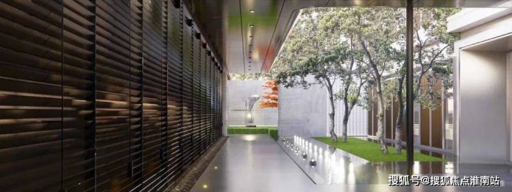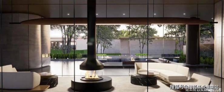 无界会客厅:大玻璃展面倒映中央水景,象征“紫气东来”的紫薇树环绕,打造度假酒店式社交空间。