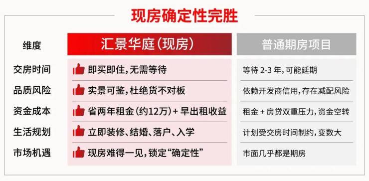与市场上普遍需要等待2-3年的期房不同,汇景华庭以实景现房+即买即住的硬核实力,为购房者提供了零等待、零风险的安心之选。