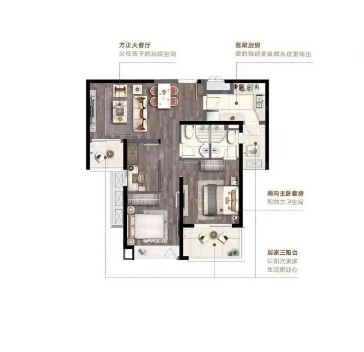 3房2卫设计:主卧套房带独立卫浴,客卫干湿分离,避免晨起抢厕所尴尬,家庭生活更有序;