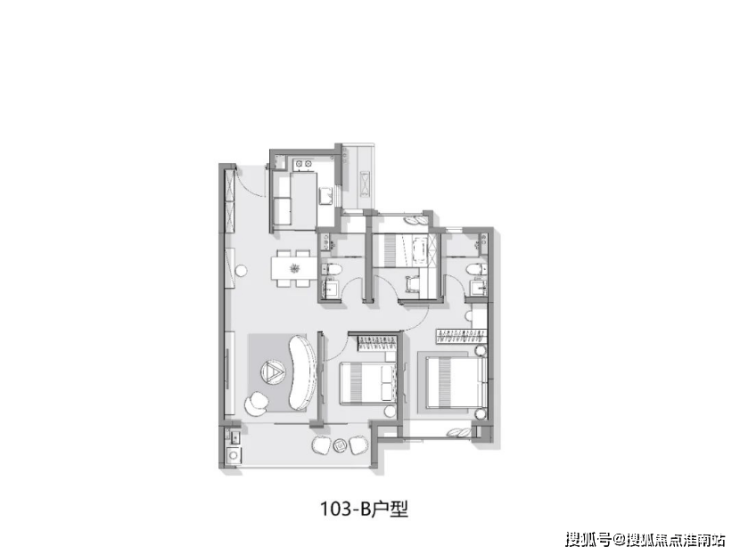 建面约103㎡3房2卫:该户型格局做到了经典LDKB餐客厨阳一体化贯通中轴的设计,极力减少过道、转角等空间浪费,撑起气场的同时,也提升了户型的实用性、家庭成员的互动性和场景感。