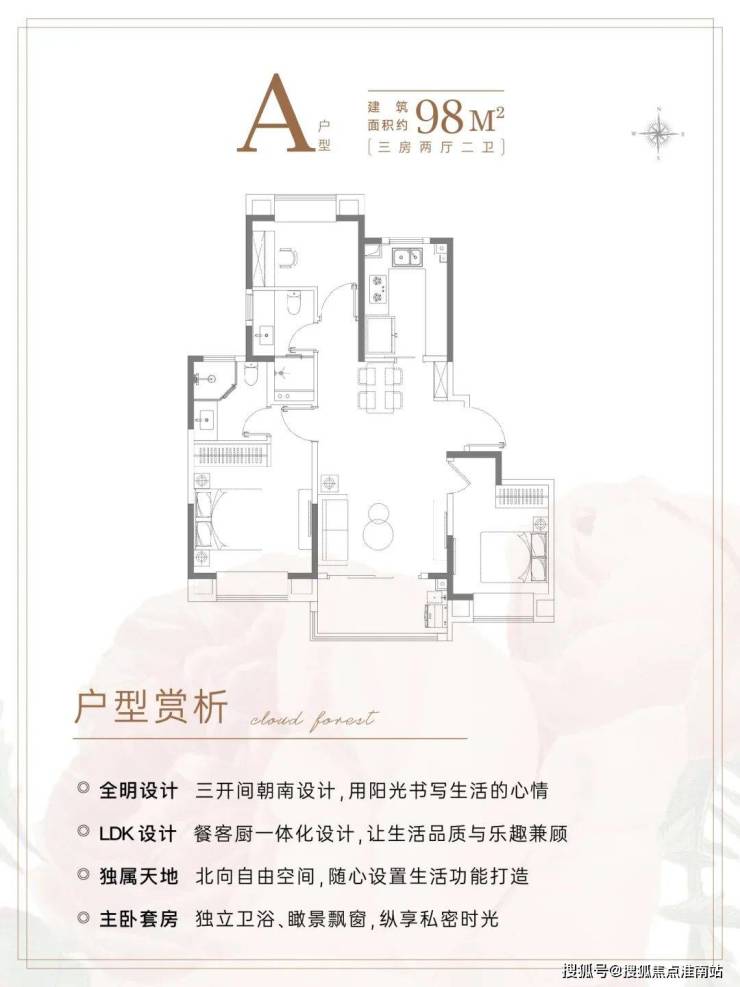 约98㎡3房2卫的爆款飞机户型,南北通透+三开间朝南,整体室内的采光、通风都做到了极致。