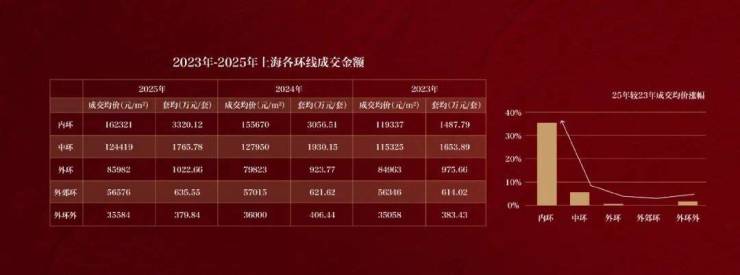从近三年上海成交数据看,中外环以及外环外成交价格基本保持稳定,内中环稳步上涨,唯独内环内呈现跳涨态势。数据显示,内环内新房成交均价从2023年约11.9万/㎡跳涨到2025年约16.23万/㎡,三年涨幅达到36%。