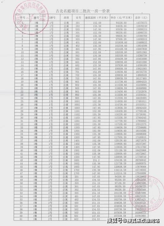 上期一房一价表如下