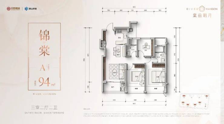 - 94㎡三房:三开间朝南,南向面宽近10米,1.5米进深阳台,独创“S墙”嵌入双开门冰箱。