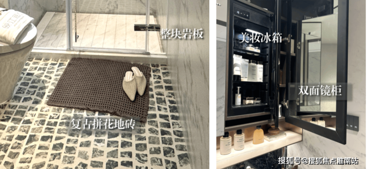室内圆弧吊顶等采用弧形线条设计,卫生间标配美妆冰箱及双面镜柜,演绎海派美学精致感。