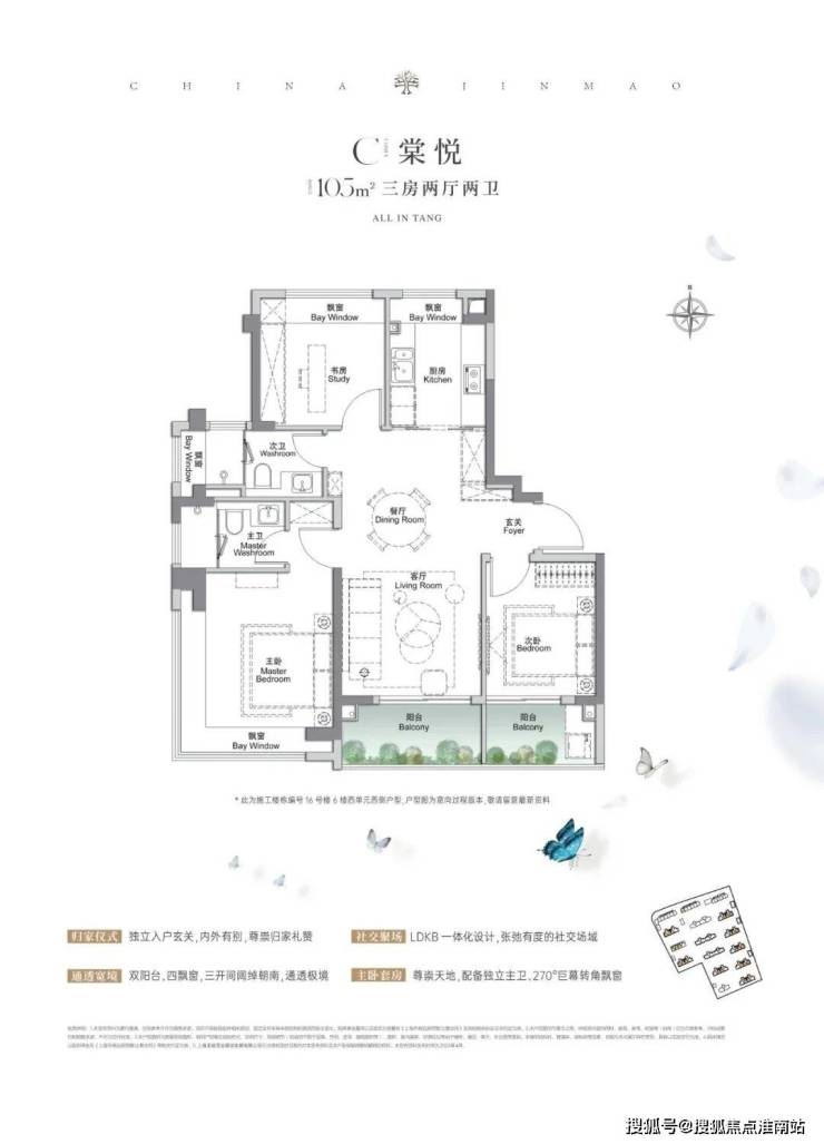 建面约105㎡3房2厅2卫,做到了 三开间朝南+4个飘窗+双面阳台系统+主卧套房设计+270°转角飘窗,该户型的居住体验、舒适度、尺度感,是同级别产品所无法比拟的。