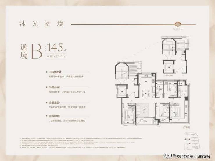 建面约145平四房为4开间朝南设计,同样是私享电梯厅和全屋飘窗设计,尤其是边套除了270°转角飘窗外,主卫也做了大尺度飘窗,采光更好。