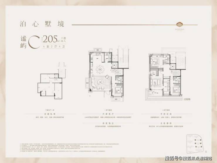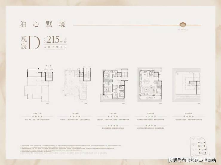 上叠户型为建面约215平四房,户型与下叠几乎一样。但有个非常大的创新点在于,上叠把卧室区域放在了三楼,将客餐厅放在了更高的四楼。这样一方面减少了对下叠卧室的隔音影响,另一方面也把顶层露台与客厅和客卧做了结合布置,功能上更加协调。