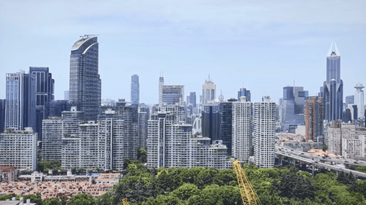 东瞰:延中绿地如翡翠铺展,新天地石库门群落与陆家嘴“三件套”同框;