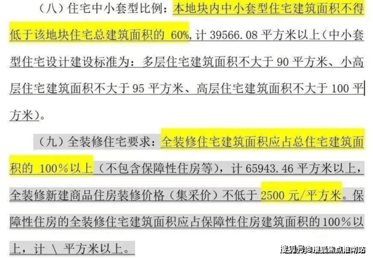根据土地转让合同要求显示,项目规划住宅套数下限656套,全部装修交付,装标2500元/m²(集采价)