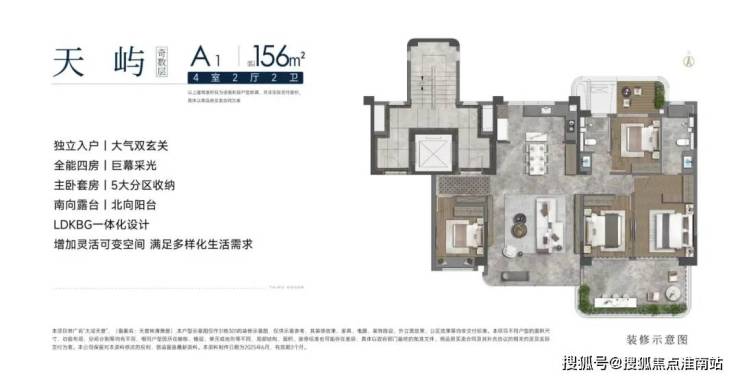 产品方面,四代洋房A1户型建面约156㎡,4房2厅2卫,四开间朝南,LDKB一体化设计,全能四房拥有通透采光,南露台+北阳台可打造多元化活动空间。