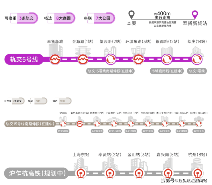 交通方面:项目多轨交环绕,5号线、15号线南延伸段(在建中)、市域嘉闵线南延伸段(规划中)、沪乍杭高铁(规划中)及南枫线(在建中)