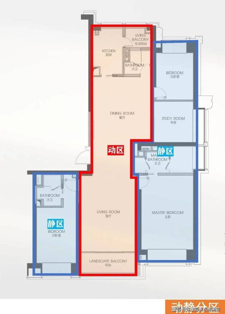 这个户型的动静分区就非常明确,动区在中间,静区的两个卧室分列两厢。