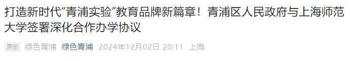 去年12月2日,青浦区人民政府与 上海师范大学签署深化合作办学协议,区校双方将在基础教育、教师教育、共建教育现代化先行实验区等方面开展深度合作,致力于扩大区域优质教育资源供给, 全面打造新时代“青浦实验”教育品牌崭新篇章。