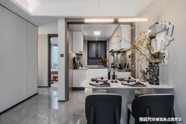 上海浦东招商象屿星耀翠湾售楼处电话☎:400-9659-259(预约看房热线)入户门设置玄关柜收纳体系,三段式设计,定制橱柜+石英石台面。