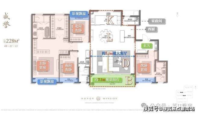 该户型LDKB一体化设计,u型厨房面宽约4.3米,客厅开间5.25米,双联阳台8米,豪华主卧套房设计。