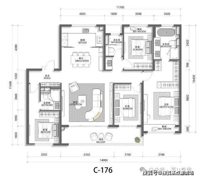 餐客厅阳台组成LDKB超大社交方厅,近80㎡的奢阔,约6.9m的客厅加上三个卧室,近乎是5开间朝南。