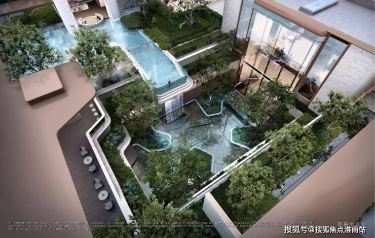 板块内领创“峡谷”意境的下沉式立体庭院,在约420平米的垂直面中,通过多层花池、叠水、软景塑造立体层次观感,遴选多种珍贵苗木,立体庭院贯通风雨连廊,给予五星级度假酒店般的空间体验。
