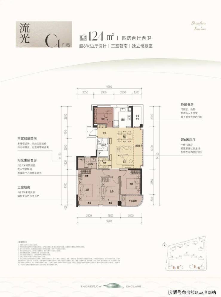 这款户型堪称四开间朝南的“流量王者”, 南向面宽约13米,双联阳台+双飘窗设计,视野和采光优秀; 套房主卧、双阳光次卧,颇有大平层的气势。