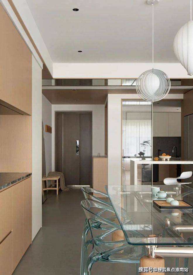 餐桌和餐椅采用了亚克力材质,半透明的特性让整个区域显得更加轻盈,视觉上扩大了空间感。