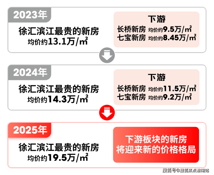 而随着徐汇滨江步入约19.5万/㎡的价格,长桥约11.5万/㎡、七宝约千万级、春申约700万级的房价格局势必会跟着一起升级。