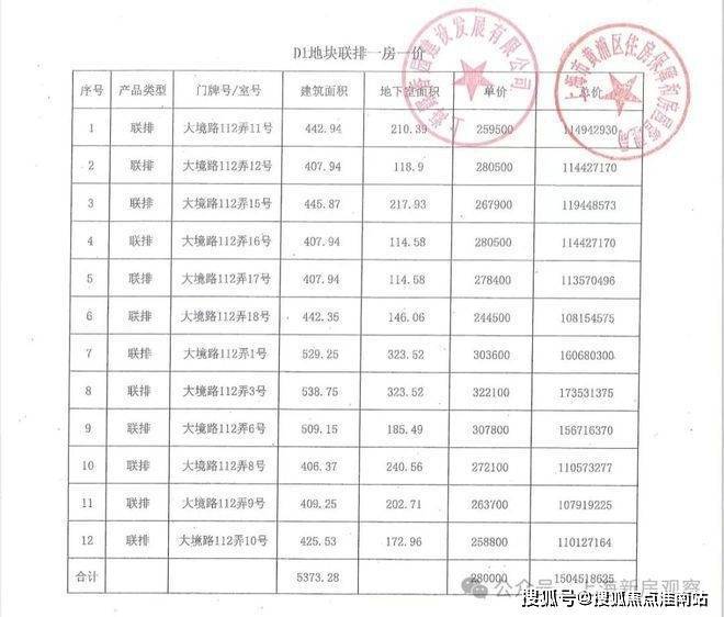 一房一价表如下