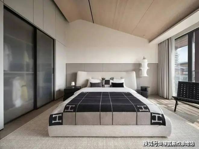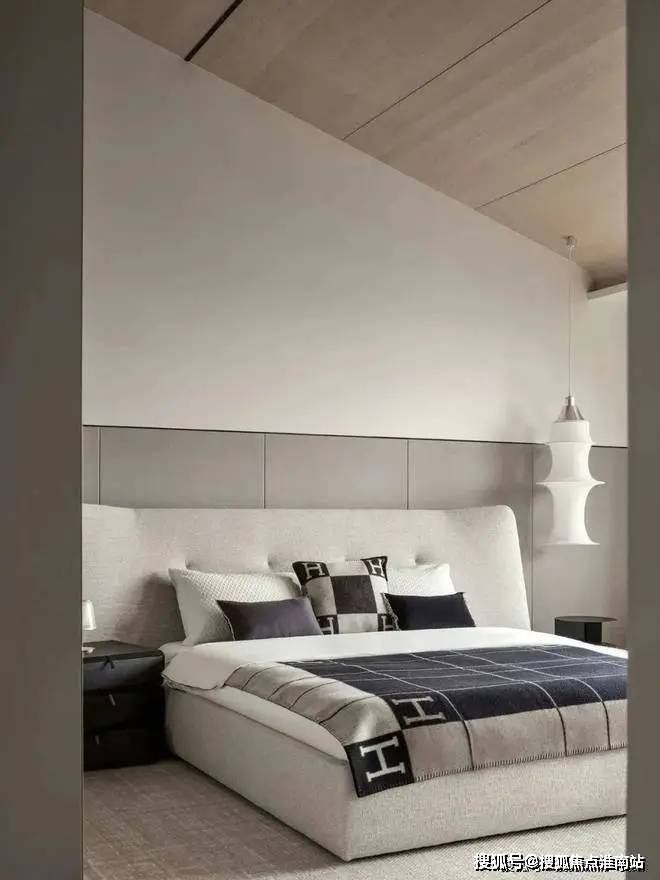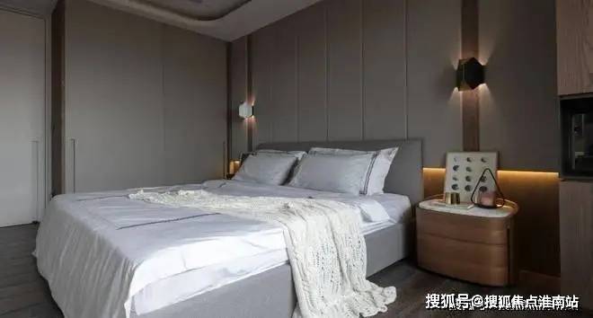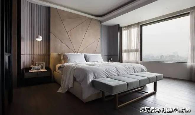 ▲卧室床头墙加入木饰面,两侧是弧形的软包质感的波纹造型板,摆上米白色的皮艺床,简约舒适的床单,床尾还有一张长凳子,整体现代优雅的卧室空间,为主人提供了一个舒适从容的休闲与睡眠体验。