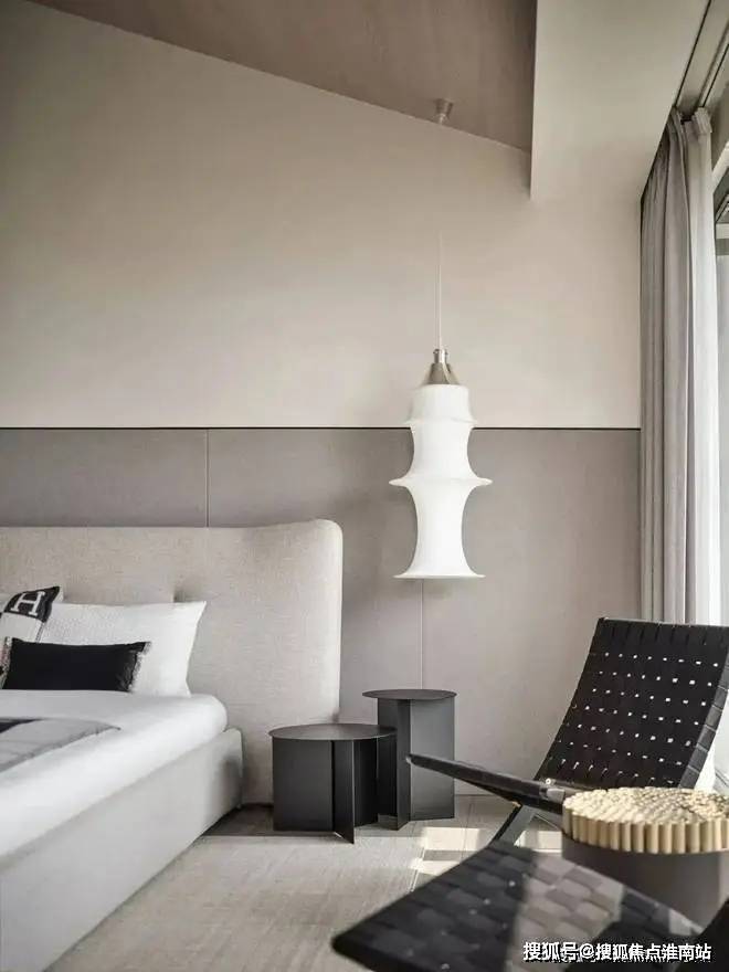 ▲床头柜上摆上精致的展示品,上方一盏球形的吊灯,在后方墙面的波纹软包造型的呼应下,也为我们布置了一个简约优雅的舒适空间感。