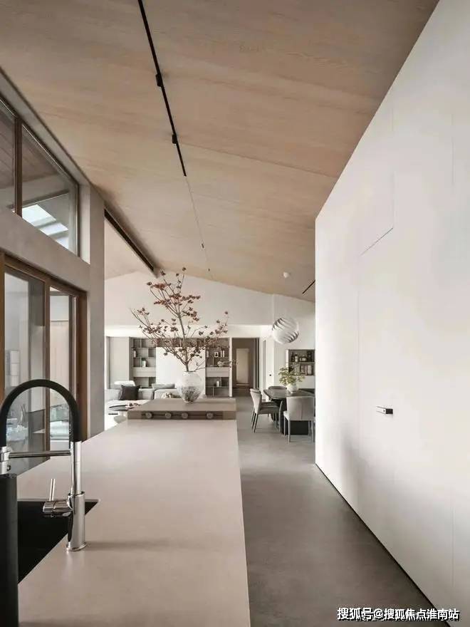 倾斜的吊顶和特意做出的错落 “断层”,增强了空间的纵深感。这种感觉不是来自单一方向,而是四面八方的张力共同形成的。