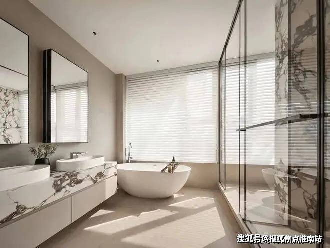 ▲墙面、地面处都是以白色砖的设计,靠窗布置一个大浴缸,结合双人位的台上盆洗手盆,也让卫浴空间显得更加干净简洁而时尚大方。