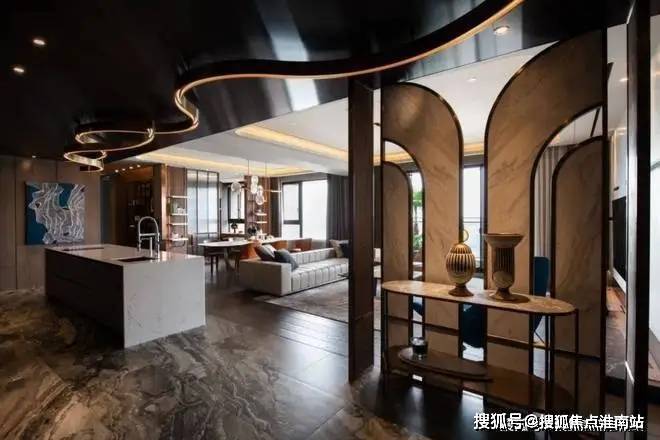 ▲玄关处加入一道金属+石材结合的屏风与端景台,布置陶艺品的装饰,让进门的第一视觉充满现代优雅的华丽感。天花上一道流线设计的造型,从玄关延伸到中岛台,也是显得更加有艺术气质。