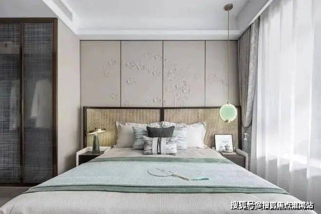 走进主卧空间,更见一派清雅之美。石膏皮雕式的床头背景墙,将梅花以立体化的形式展现,赋予空间更多的画意感。