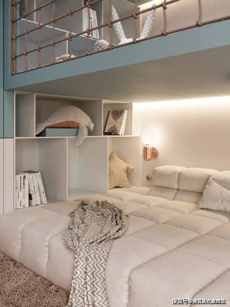 儿童区域则增添了更多的色彩,备显轻松、活力,浅蓝色让人如临海洋,黄色积极活泼有张力,而米色作为主颜色打底,遍布整体空间,来给予温馨、居家的氛围感。