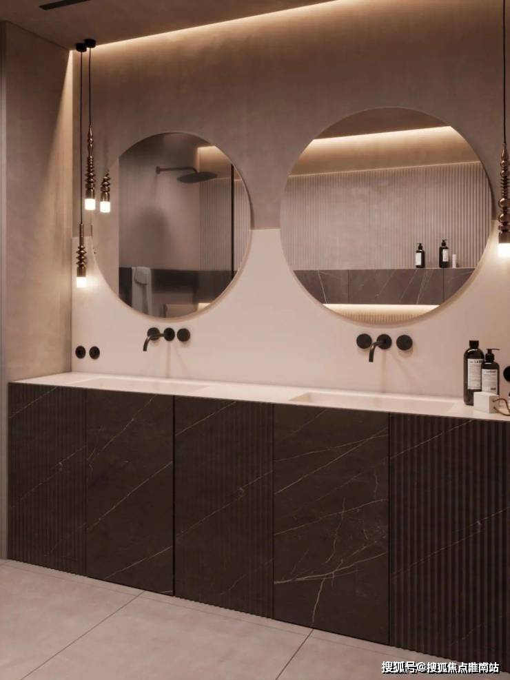 卫生间宽敞而明亮,摈弃过多的射灯或主灯,而是沿用部分照明灯具,立面的装饰线条参差不齐却独有韵味,深色大理石柜体压低了空间的调性,让空间的层次轻重分明。