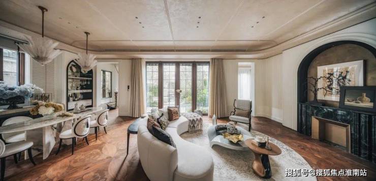 利用本身超大面宽属性,做出非常大的落地窗,这些窗又用很多传统的线条将它进行分割装饰,连续方格长窗,既保障了室内通透采光,又还原了花园别墅的线条美感与风情。